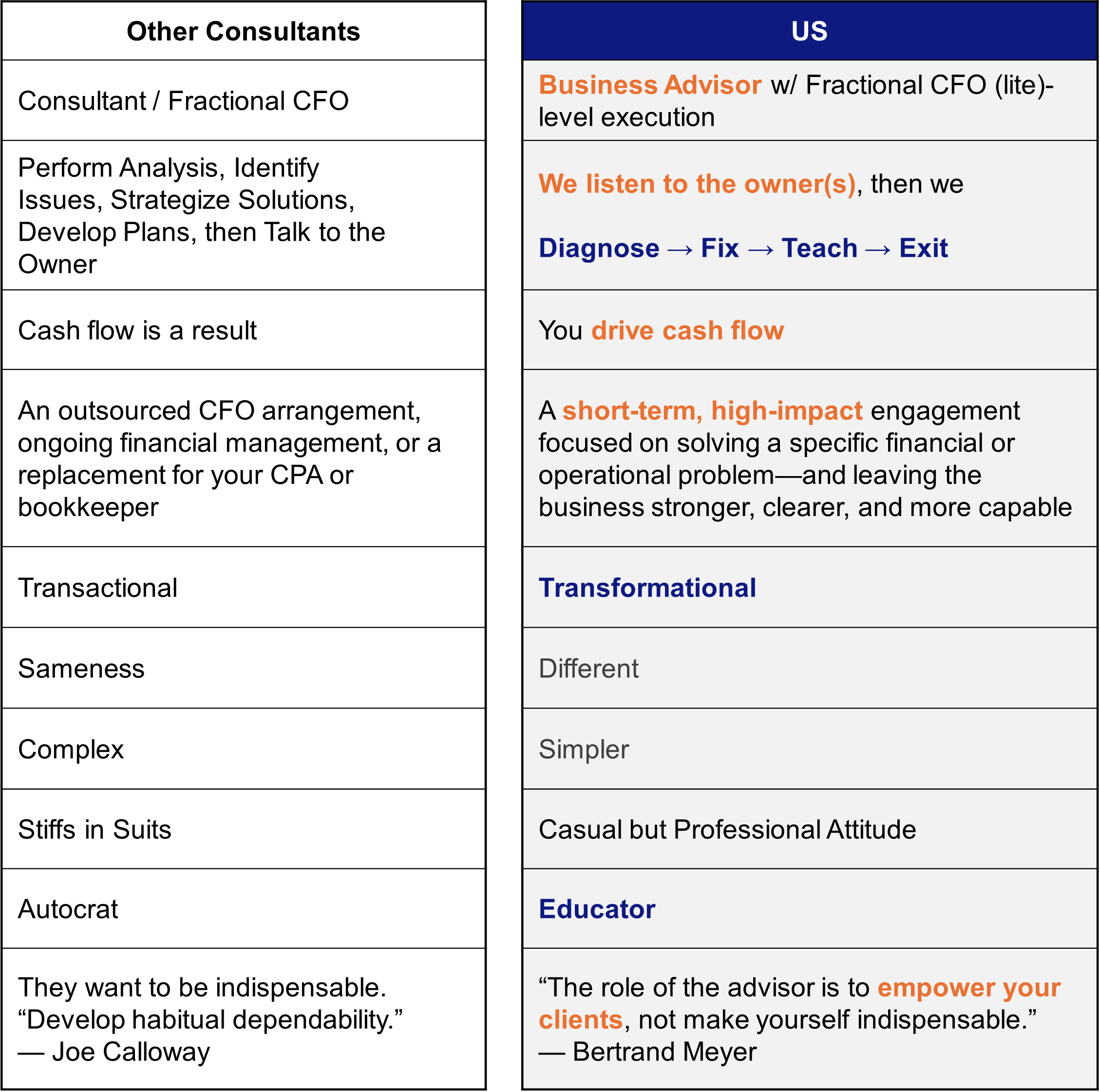 We help business owners understand their cash-generating abilities, solving the “profit-rich, cash-poor” dilemma by using an array of cash flow-focused techniques.